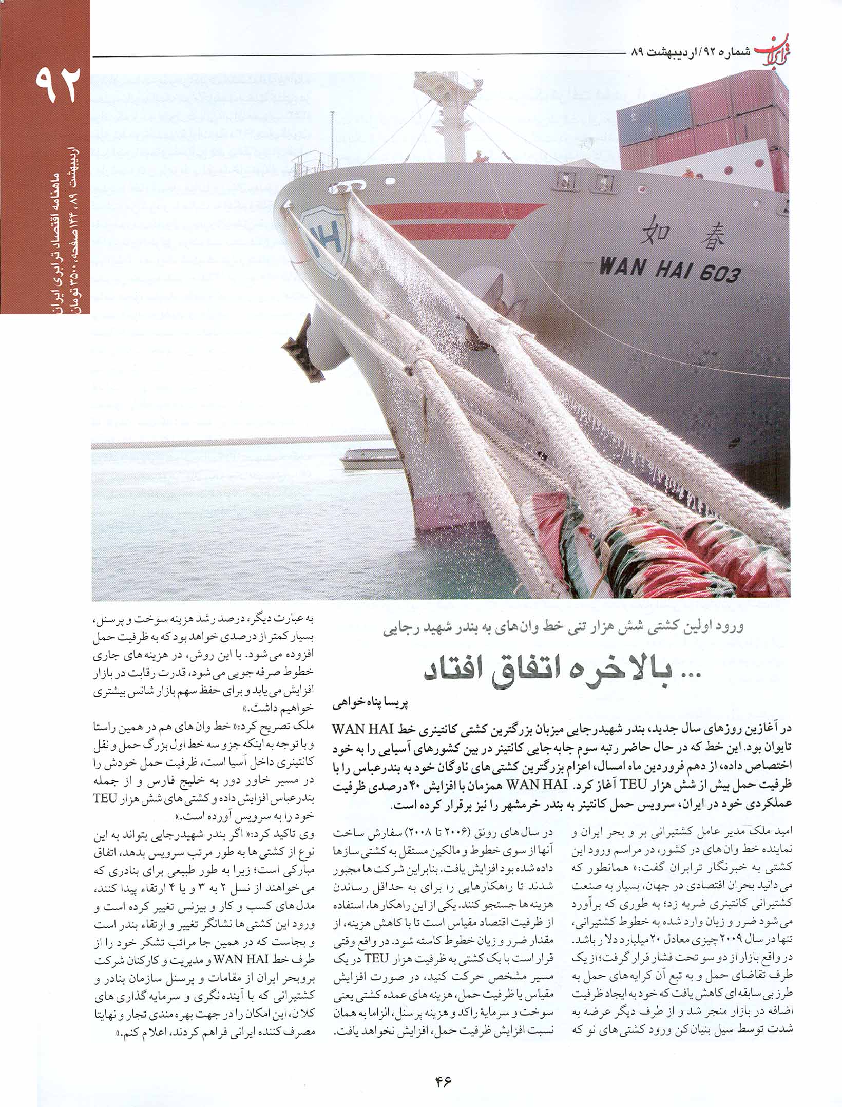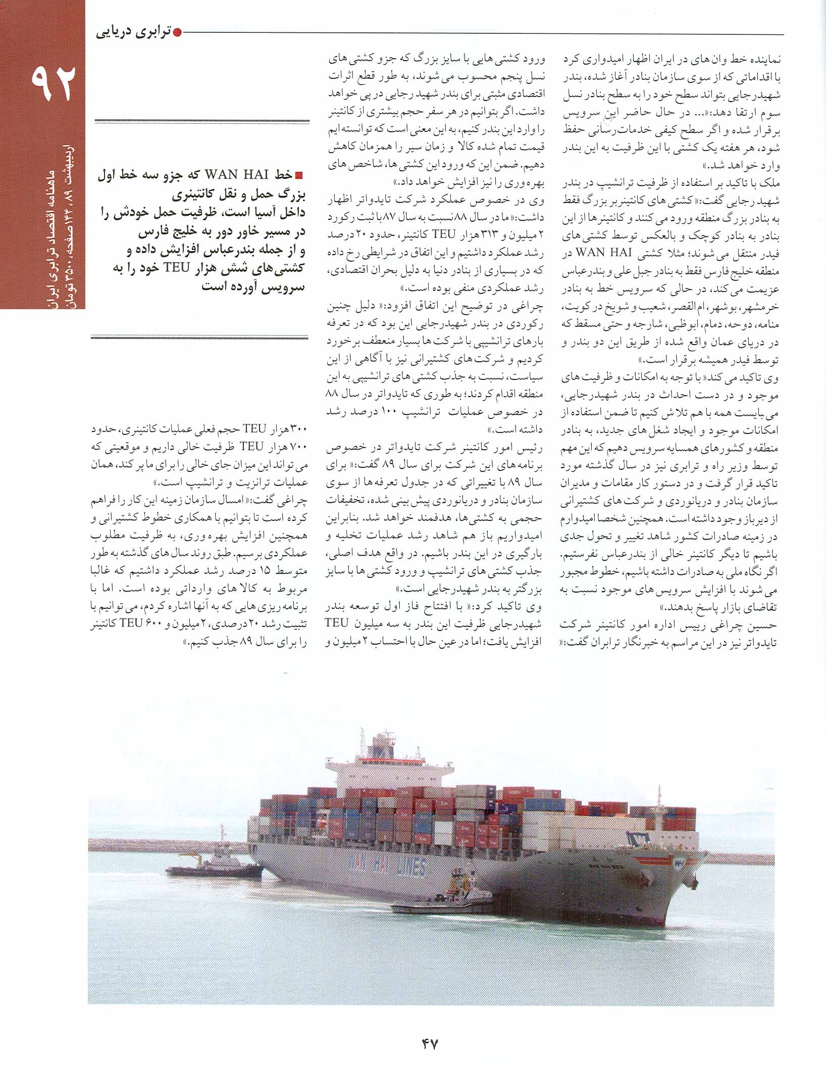 ورود اولین کشتی شش هزار تنی خط WAN HAI به بندر شهید رجایی